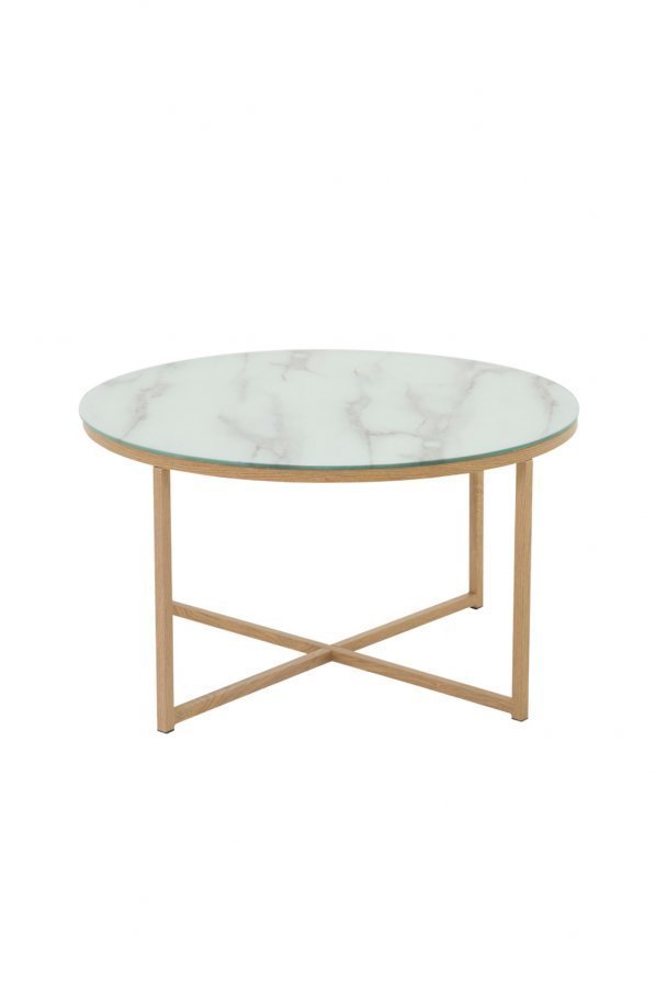 Moderni sohvapöytä. Pöytälevy karkaistua lasia, jossa marmorikalvo. Tammea muistuttavat metallijalat. Halkaisija: 80 cm, korkeus: 45 cm.