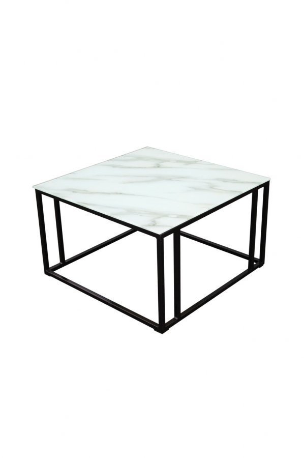 Moderni sohvapöytä. Pöytälevy karkaistua lasia, jossa marmorikalvo. Mustat metallijalat. Leveys: 75 cm, pituus: 75 cm, korkeus: 45 cm