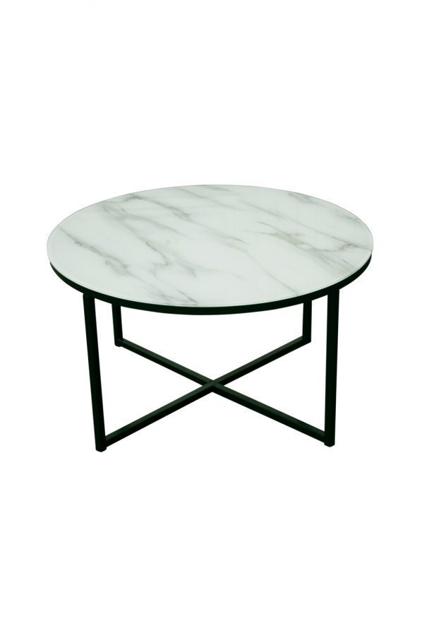 Moderni sohvapöytä. Pöytälevy karkaistua lasia, jossa marmorikalvo. Mustat metallijalat. Halkaisija: 80 cm, korkeus: 45 cm.