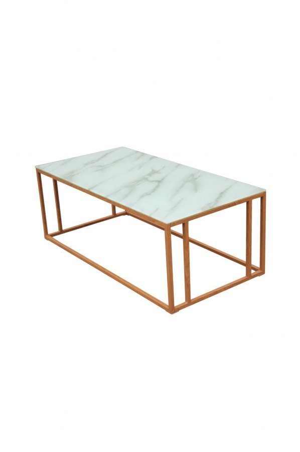Moderni sohvapöytä. Pöytälevy karkaistua lasia, jossa marmorikalvo. Tammea muistuttavat metallijalat. Leveys: 60 cm, pituus: 120 cm, korkeus: 45 cm