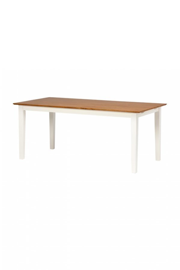 Ruokapöytä tammiväriseksi petsattua/lakattua kumipuuta. Valkoiseksi maalatut jalat. 180×90 cm. Korkeus 75 cm. Toimitetaan osina. Rahtipaino 55 kg. Tarkista rahtimaksu Toimitus-välilehdeltä.