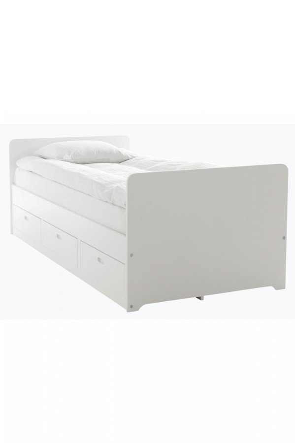 Maalattua MDF-levyä. Kolme laatikkoa, L65xS40xK20 cm. Laatikot voi sijoittaa kummalle puolelle sänkyä tahansa. Ulkomitat 96×210 cm, korkeus 70 cm. Vuodemitat 90×200 cm. Sopii runkopatjalle (tilattava erikseen). Toimitetaan osina. Rahtipaino 95 kg. Tarkista rahtimaksu Toimitus-välilehdeltä. Tarkista rahtimaksu Ostotiedoista.