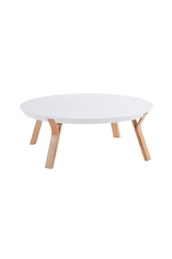 Pyöreä sohvapöytä, jonka puurunko saarnia ja mattapintaiseksi maalattu pöytälevy puukuitua. Korkeus: 32 cm Leveys: 90 cm Syvyys: 90 cm