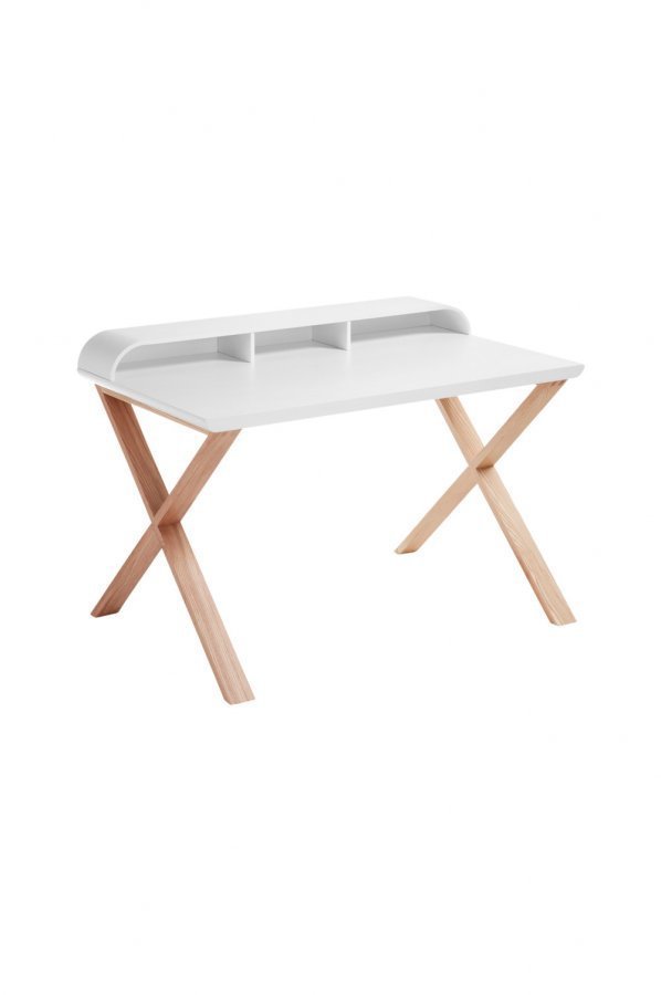 Kirjoituspöytä MDF-levyä. Säilytyslokerot. Jalat saarnea. 120×79 cm. Pöytälevyn korkeus maasta 71 cm. Toimitetaan osina.