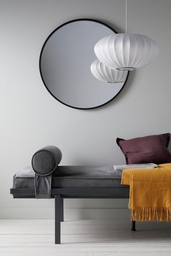 Pyöreä peili, jonka kehys metallia. Ripustetaan seinälle (takana seinäkiinnike). Ø 80 cm. Syvyys 2,5 cm.