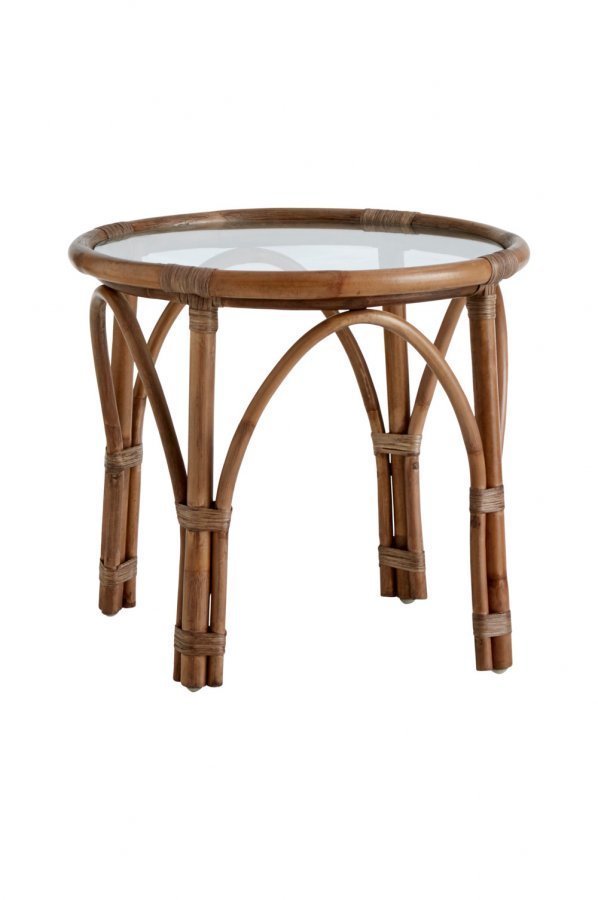 Pöytä rottinkia, pöytälevy karkaistua lasia. Ø 50 cm, korkeus 45 cm. Toimitetaan koottuna. Sijoita pöytä katoksen alle, sillä rottinki on herkkä sekä kosteudelle että kuivumiselle.