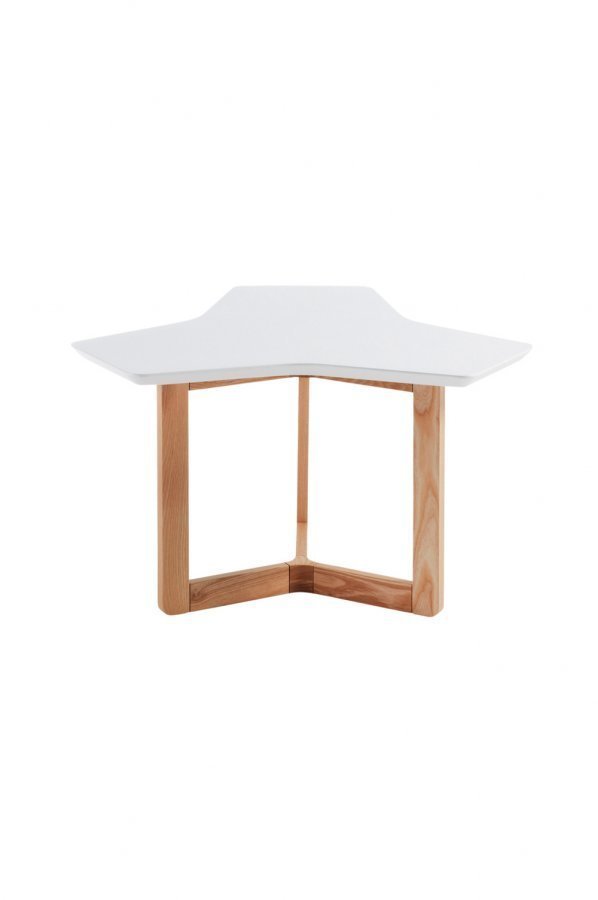 Sohvapöytä, jonka puurunko saarnia ja mattapintaiseksi maalattu pöytälevy puukuitua. Korkeus: 45 cm Leveys: 76 cm Syvyys: 67 cm