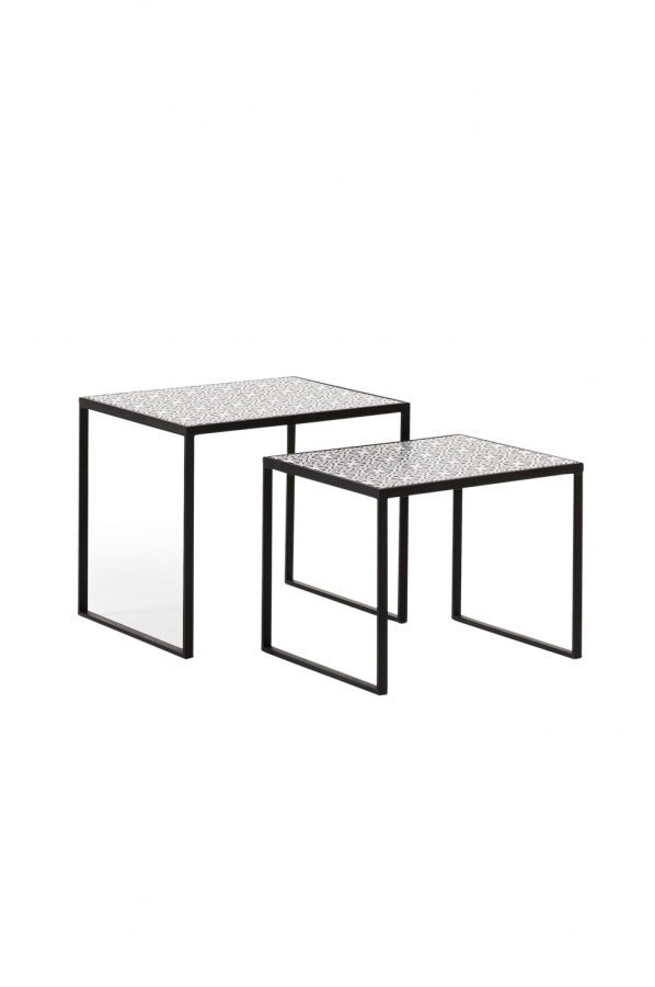 Kaksi sarjapöytää, joissa metallirunko ja MDF-pöytälevy painetuin mosaiikkikuvioin. Korkeus 45/38 cm Leveys 55/50 cm Syvyys 43/40 cm