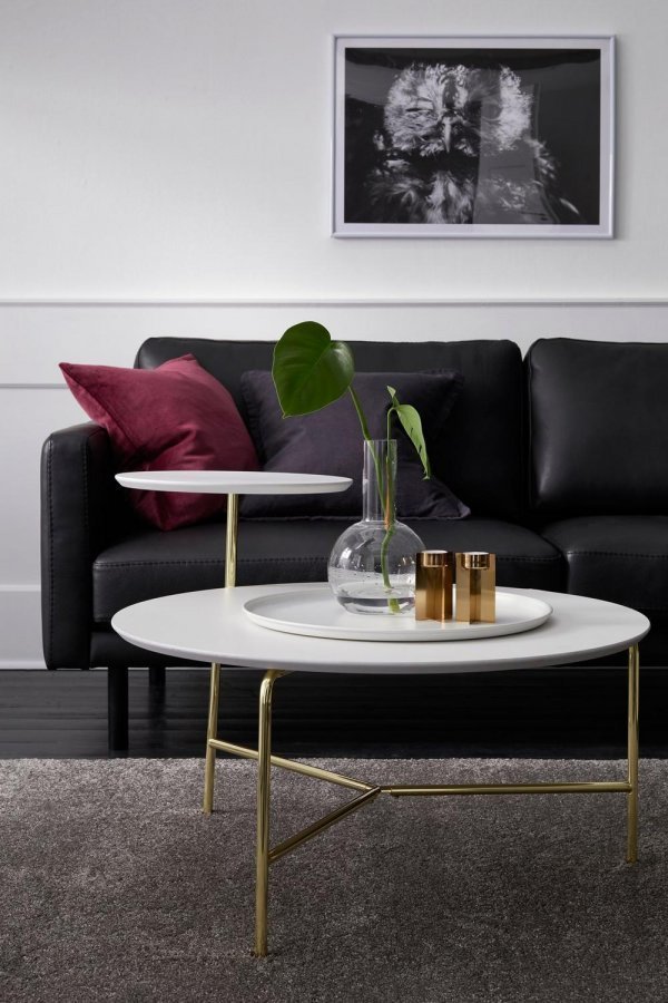 Sohvapöytä, jossa suurempi ja pienempi pöytälevy MDF-levyä. Teline metallia. Mukana metallitarjotin. Iso levy: Korkeus 40 cm, Ø 79 cm. Pieni levy: Korkeus 59 cm, Ø 40 cm. Tarjotin Ø 46 cm. Pöytä toimitetaan osina.
