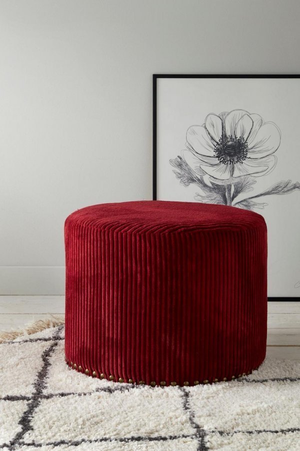 Rahi, jossa päällinen leveävakoista vakosamettia ja hopeanväriset koristeniitit alareunan ympärillä. Puurunko. Korkeus 37 cm. Ø 50 cm.