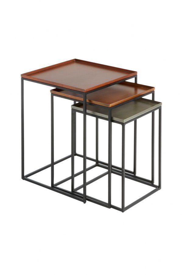 Kolme sarjapöytää kupari-, sinkki- ja messinkipinnoin. Korkeus 52/47/42 cm Leveys 41/36/31 cm Syvyys 41/36/31 cm