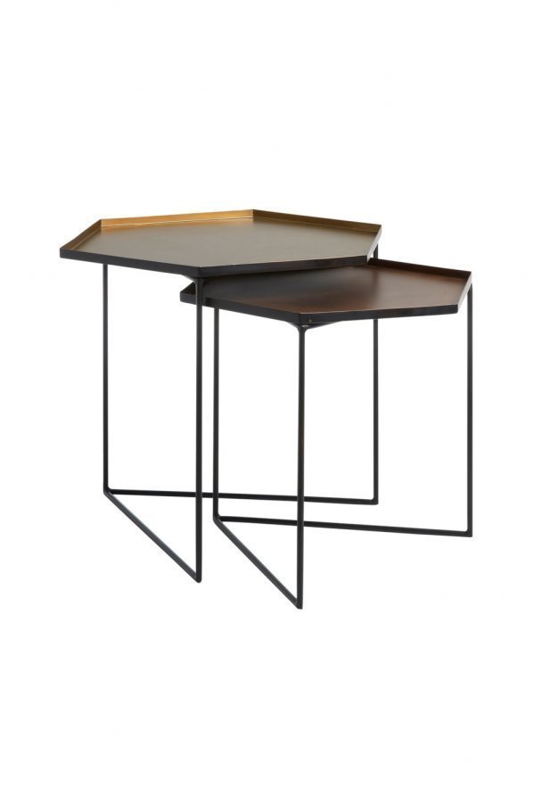 Sarjapöytä metallia. Ison messinginvärisen pöydän halkaisija 57 cm, korkeus 47 cm. Pienen kuparinvärisen pöydän halkaisija 50 cm, korkeus 42 cm. Toimitetaan koottuna.