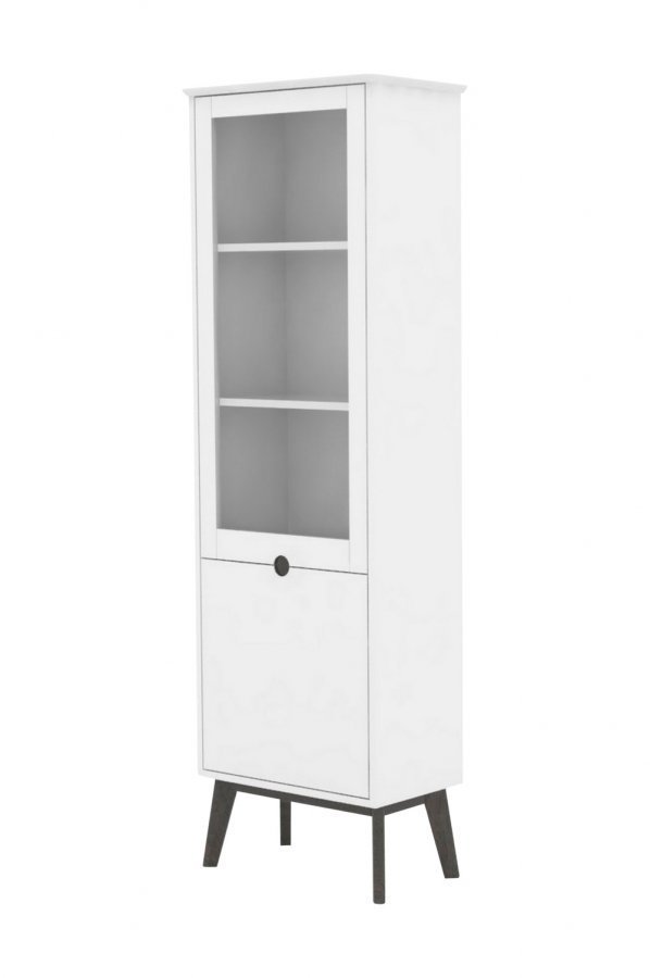 Vitriinikaappi, jossa 2 ovea. Toinen ovi lasia. Maalattua MDF-levyä ja jalat maalattua saarnea. Leveys 57 cm, syvyys 35 cm, korkeus 190 cm. Toimitetaan osina. Enimmäiskuormitus 20 kg/hylly. 3 säädettävää hyllytasoa.