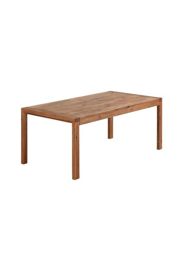 Ruokapöytä massiivitammea, jatkolevy mukana. 100×200 + 80 cm. Korkeus 77 cm. Toimitetaan osina.