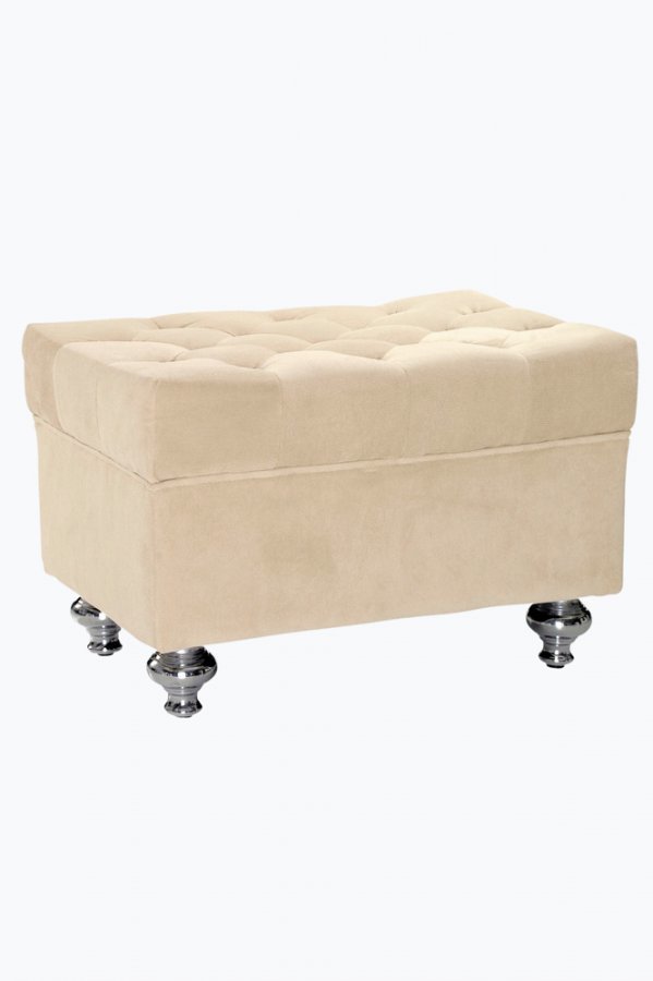 Runko massiivimäntyä. Päällinen polyesterisamettia. Täyte vaahtomuovia. Jalat krominväristä metallia. Koko 59×40 cm. Korkeus 39 cm.