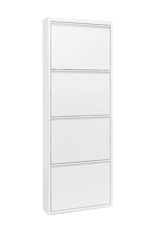 Metallinen kenkähylly, jossa neljä ovea. Korkeus 136 cm Leveys 50 cm Syvyys 15-39,5 cm