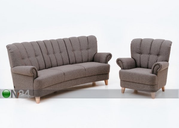 Ryhmään sisältyy kolmenistuttava sohva ja nojatuoli – runko on valmistettu vanerista ja puusta… Lue lisää »