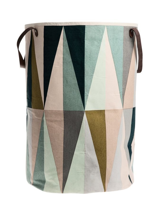 Lieriönmuotoisessa pyykkikorissa on värikäs geometrinen kuosi ja nahkaiset kantokahvat. Sisäpuolella on kestävä pinnoite, jonka voi pyyhkiä puhtaaksi kostealla liinalla. Materiaali on puuvillaa. Korin halkaisija on 40 cm, korkeus 60 cm.