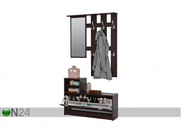 Kaksiosainen eteisryhmä on valmistettu laadukkaasta melamiinipinnoitetusta kalustelevystä – ryhmään sisältyy naulakko peilillä sekä… Lue lisää »