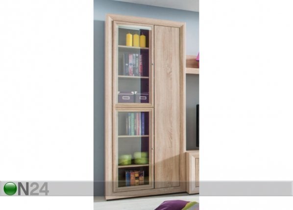 Vitriinikaappi on valmistettu kalustelevystä – kahdessa ovessa on lasi – ovien takana on… Lue lisää »