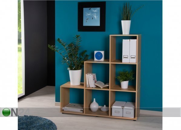 Pyökin sävyisestä fooliumipinnoitetusta kalustelevystä valmistettu hyllystö-tilanjakaja – hyllystössä on kuusi avohyllyä – kuusi… Lue lisää »