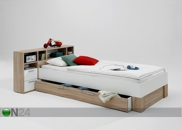 Sänkysarja on valmistettu kalustelevystä – päädyssä hyllystö kahdella hyllyllä, sängyn alla on vuodevaatelaatikko… Lue lisää »