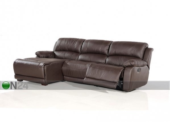 Mukava kulmasohva säädettävällä jalkatuella – istuin, selkänoja, käsinojat ja jalkatuki on verhoiltu tummanruskealla… Lue lisää »