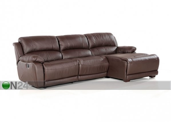 Mukava kulmasohva säädettävällä jalkatuella – istuin, selkänoja, käsinojat ja jalkatuki on verhoiltu tummanruskealla… Lue lisää »