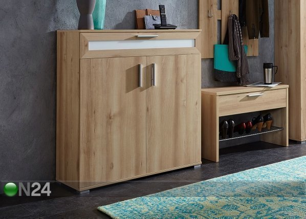 Kalustelevystä valmistetussa jalkinekaappissa on laatikko ja kaksi ovea, laatikon etupaneeli on osittain maitovalkoista… Lue lisää »