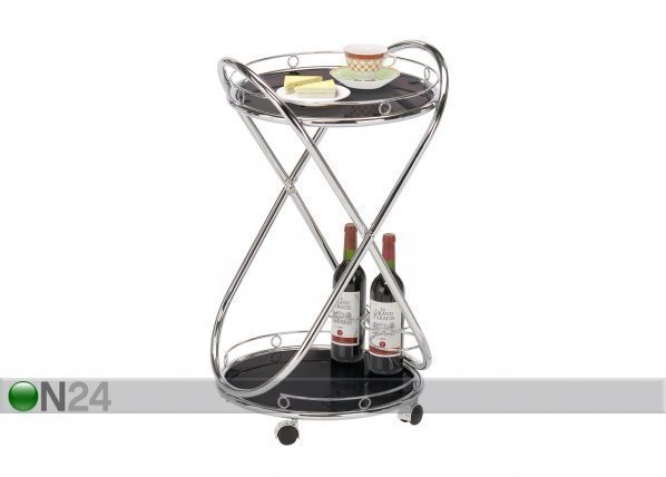 Tarjoilupöydän tasot on valmistettu mustasta karkaistusta lasista – runko kromattua metallia – alatasossa… Lue lisää »