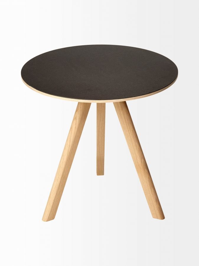 Näppärän pyöreä Copenhague-pöytä seisoo tukevasti kolmella jalallaan. Pöydän materiaali on saippuakäsiteltyä tammea ja linoleumia. Mitat ovat korkeus 49 cm ja halkaisija 50 cm.
