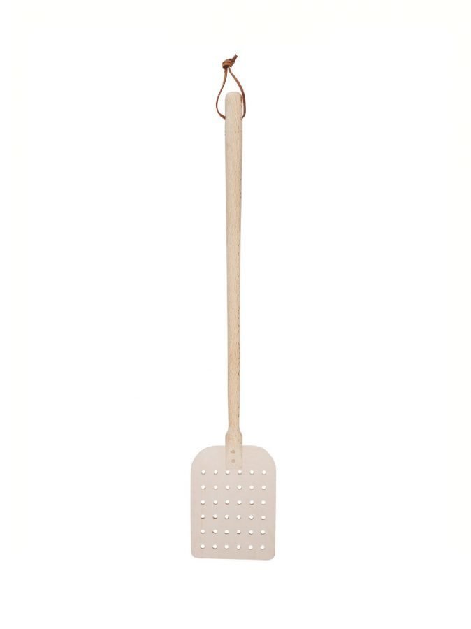 Napakan kärpäslätkän varsi on materiaaliltaan pyökkiä ja lätkäosa öljyttyä nahkaa. Mitat ovat 50 x 9,5 cm.
