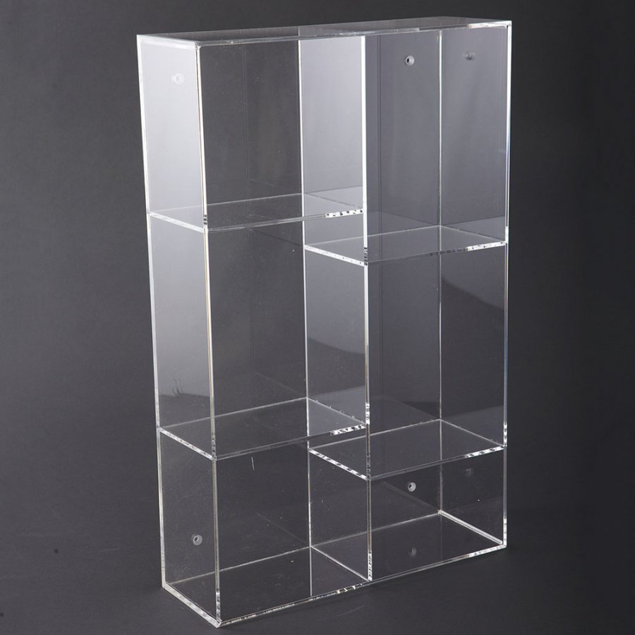 Hylly on valmistettu akryylista/pleksilasista. Hyllyssä 6 lokeroa.