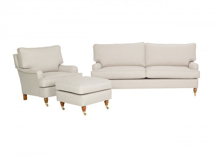 Beige Howard-tyylinen sohvaryhmä. Huonekalujen tyynyt ovat täytetty vaahtomuovilla ja kuitutäytteellä, jotta saataisiin ihanteellinen istumismukavuus. Runko… Lue lisää »