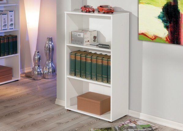 Valkoinen, melamiinipinnoitetusta kalustelevystä valmistettu hyllystö – kaksi hyllyä säädettävällä korkeudella – neljä muovijalkaa… Lue lisää »