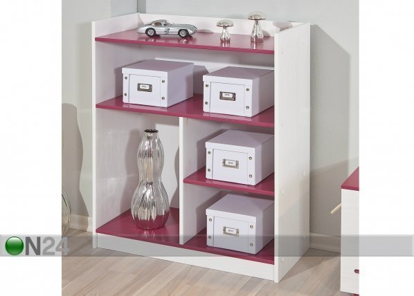 Valkoiseksi ja liilanpunaikseksi maalattu hyllystö on valmistettu mdf-kalustelevystä ja massiivipuust – yksi leveä… Lue lisää »