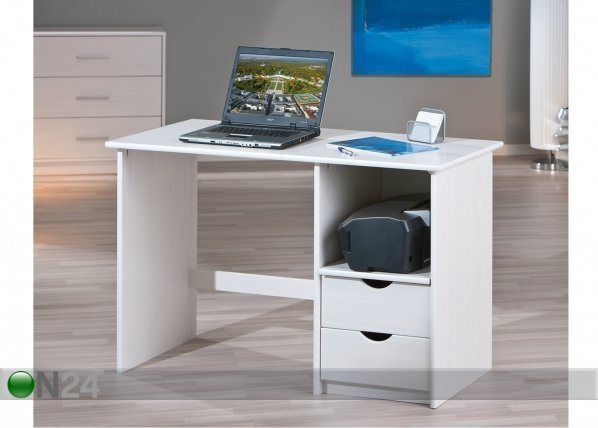 Kirjoituspöytä on valmistettu valkoiseksi petsatusta männystä – kaksi metallikiskoilla avautuvaa laatikkoa – laatikoiden… Lue lisää »