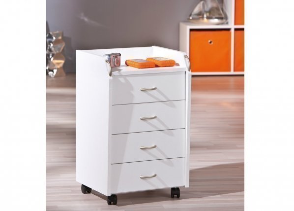Valkoinen, pyörillä valmistettu laatikosto on valmistettu kalustelevystä – neljä metallikiskoilla liukuvaa laatikkoa -… Lue lisää »
