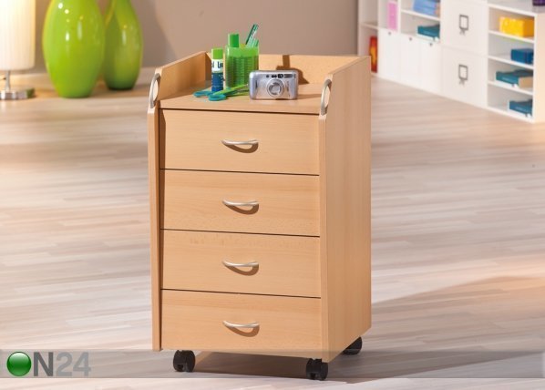 Pyökin sävyinen, pyörillä valmistettu laatikosto on valmistettu kalustelevystä – neljä metallikiskoilla liukuvaa laatikkoa… Lue lisää »