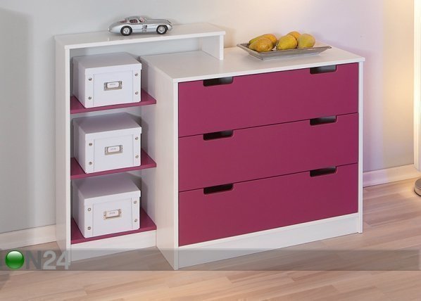 Valkoiseksi ja liilanpunaiseksi maalattu lipasto hyllystöllä on valmistettu mdf-kalustelevystä ja massiivipuusta – kolme… Lue lisää »
