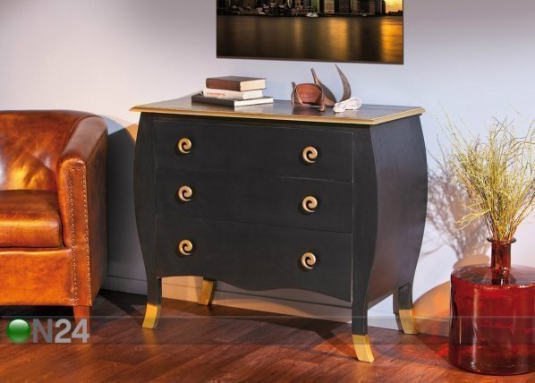 Barokkityylinen lipasto on valmistettu massiivipuusta, maalattu mustaksi ja kullansävyiseksi – lipastossa on kolme… Lue lisää »