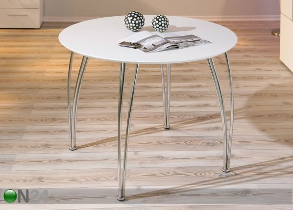 Pyöreä ruokapöytä on valmistettu valkoiseksi maalatusta mdf-kalustelevystä – pöydän jalat on valmistettu kromatusta… Lue lisää »