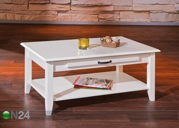 Sohvapöytä on valmistettu valkoiseksi maalatusta männystä – pöydän kannen alla on ulosvedettävä levy… Lue lisää »