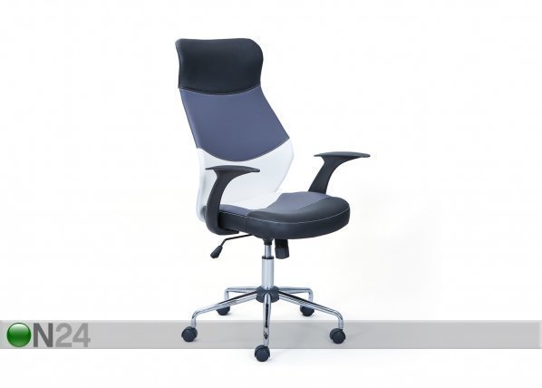 Työtuoli on verhoiltu mustalla, harmaalla ja valkoisella keinonahalla – tuolissa on keinumekanismi säädettävällä… Lue lisää »
