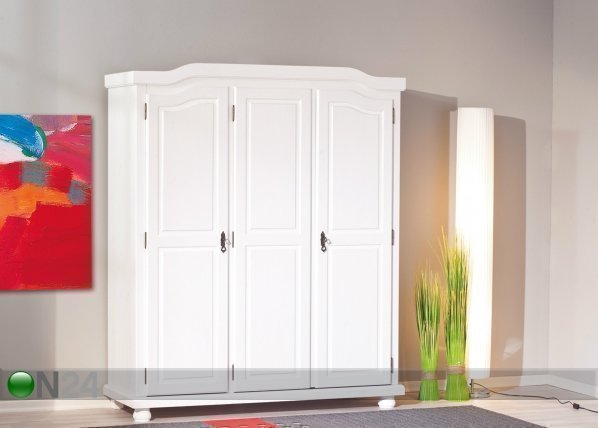 Vaatekaappi on valmistettu valkoiseksi petsatusta männystä – kolme saranoilla avautuvaa ovea – yhden… Lue lisää »