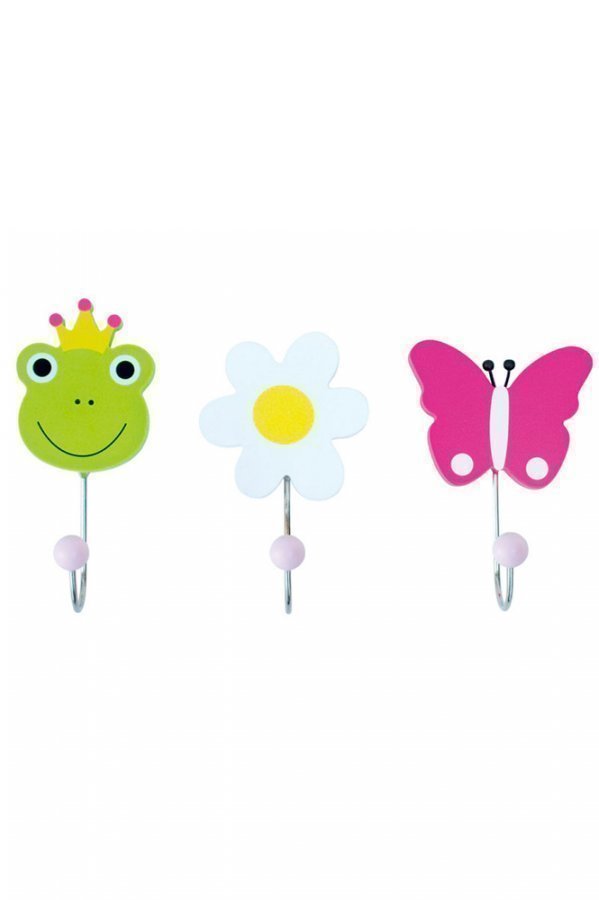 Lastenhuoneen sievät koukut puuta ja metallia. Kolme eri kuviota: sammakko, kukka ja perhonen. Vaatteiden ripustukseen ja sisustusdetaljiksi.