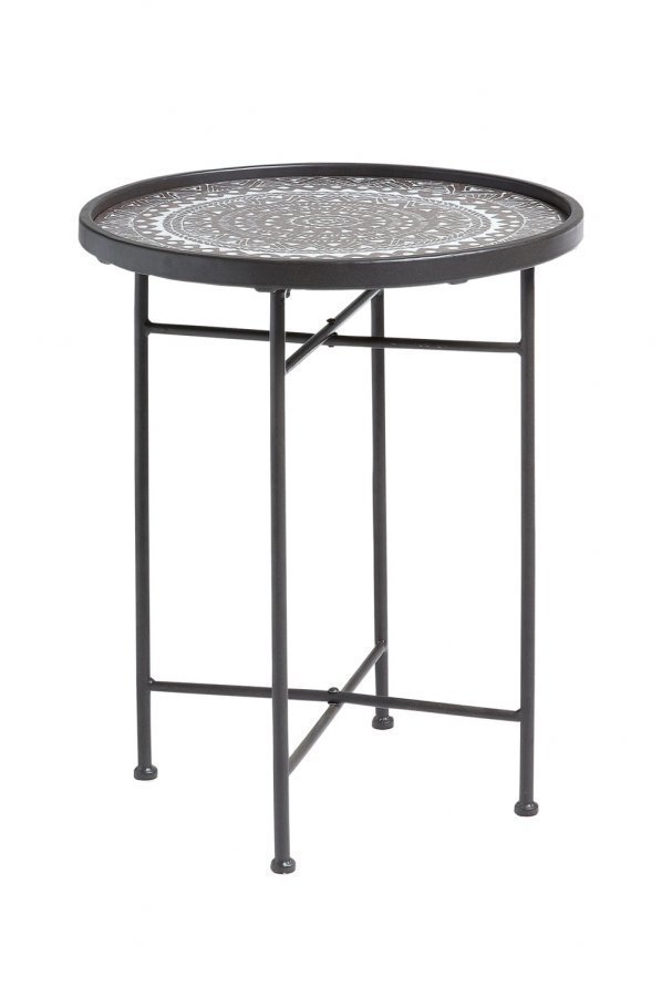 Metallinen sivupöytä, jossa kuviollinen pöytälevy. Korkeus 53 cm Leveys 45 cm Syvyys 45 cm