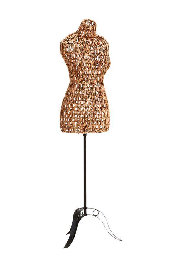 Sovitusnuken mallinen naulakko punottua luonnonkuitua. Jalka mustaa metallia. Korkeus 145 cm Leveys 43 cm Syvyys 25 cm