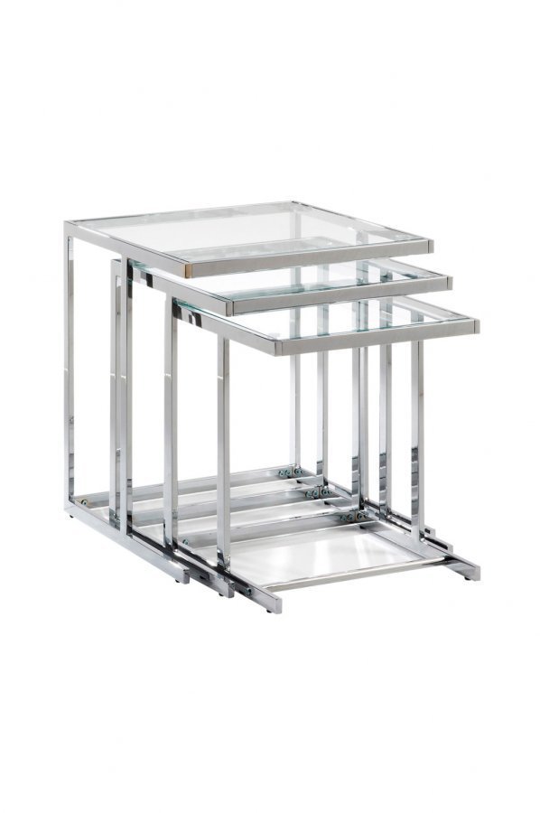 Kolme sarjapöytää, joissa jalat kromattua terästä. Pöytälevy läpinäkyvää karkaistua lasia. Korkeus 55/50/45 cm Leveys 50/45/40 cm Syvyys 50/45/40 cm