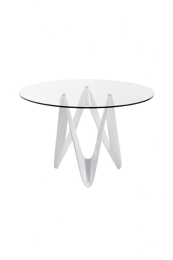 Pöytä, jossa jalat maalattua lasikuitua. Pöytälevy karkaistua lasia. Korkeus 76 cm Leveys 120 cm Syvyys 120 cm